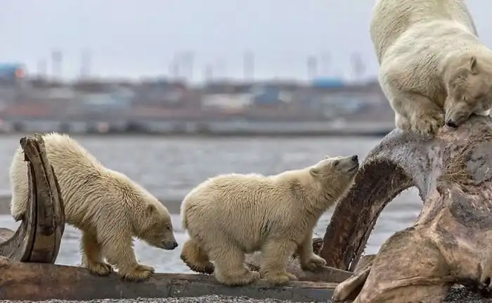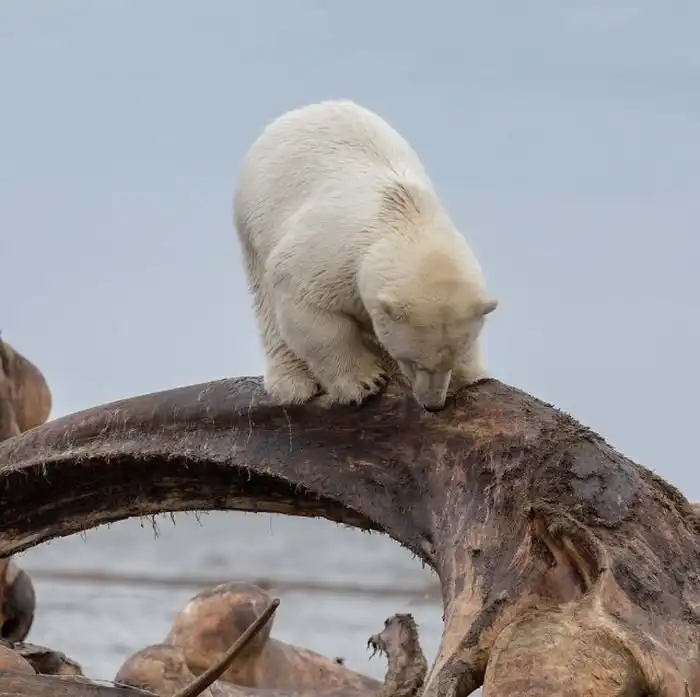 Эти кадры были сделаны вблизи американского города Кактовик, что находится на Аляске. Медведица с парой медвежат наткнулась на останки кита и решила найти хоть немного мяса. Засунув голову в отверстие в кости, хищница застряла там, но через некоторое время все же сумела выбраться из западни.