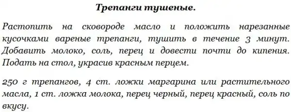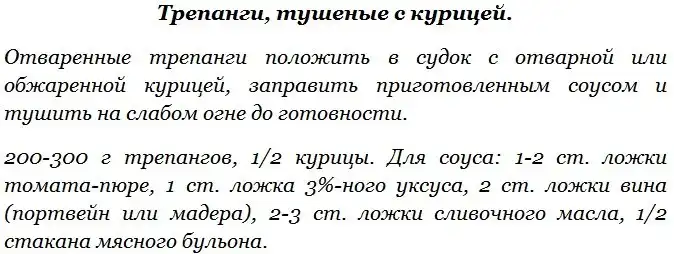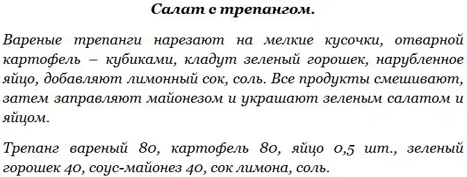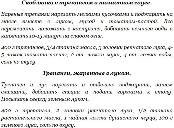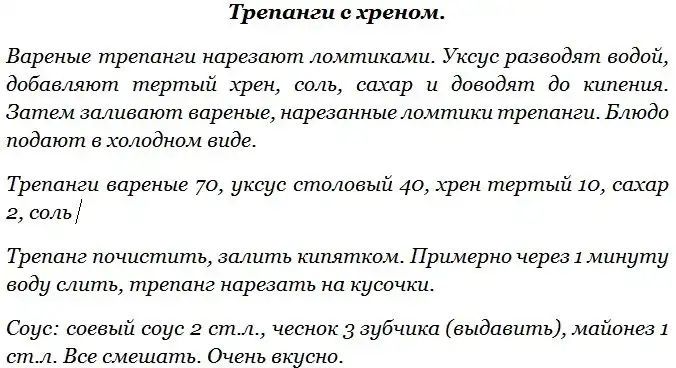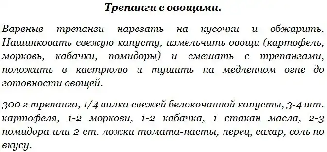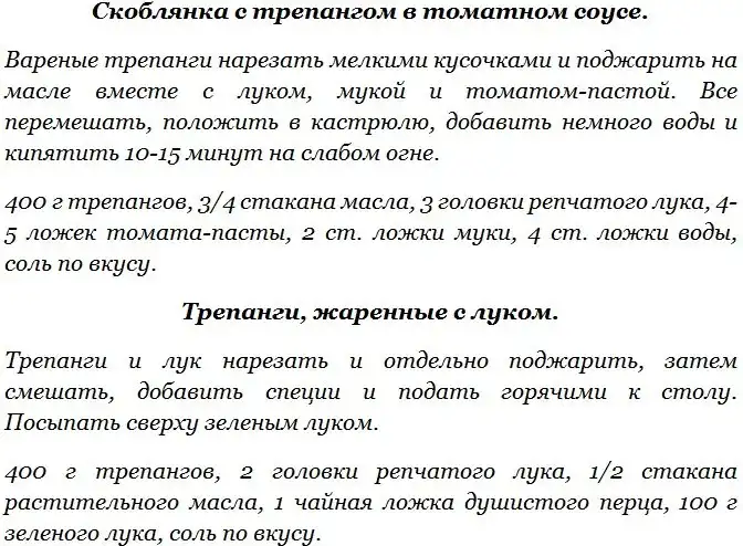 Среди многочисленных видов голотурий наибольшую ценность для промысла представляет трепанг и кукумария. Трепанг и кукумария имеют сходство в строении тела и химическом составе мяса. Трепанг содержит биологически ценные вещества (стимуляторы), за что его в странах Востока называют морским корнем жизни (женьшенем) и широко рекомендуют страдающим упадком физических сил и повышенной утомляемостью. Употребление в пищу трепанга способствует укреплению нервной системы. Промысел трепанга ведется весной и осенью только на Дальнем Востоке. Добытых трепангов разделывают на месте лова – надрезают брюшко и удаляют внутренности. Зачищенных трепангов промывают и варят 2-3 часа, пока мясо не станет мягким, после чего его используют для приготовления кулинарных блюд.