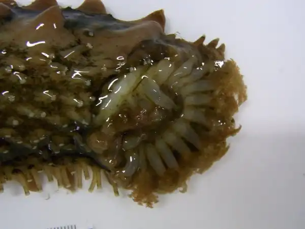 Однако не все голотурии развиваются таким путем. Сейчас известно свыше 30 видов морских кубышек, которые проявляют заботу о потомсте и вынашивают молодь. У таких видов, распространенных главным образом в холодных водах, стадия свободноплавающей личинки утрачивается и яйца развиваются либо за счет большого количества желтка, либо получая питание непосредственно от материнского организма. В самом простом случае яйца и молодь развиваются на поверхности тела матери, например под защитой разросшихся скелетных пластинок, или в набухших кожных валиках спины, или просто прикрепившись к ползательной подошве. Дальнейшие изменения привели к образованию кожных углублений, внутренних выводковых камер, вдающихся во вторичную полость тела, а у ряда ветвистощупальцевых и безногих голотурий —к развитию молоди до поздних стадий непосредственно в полости тела самки. Во всех этих случаях пол голотурий легко различим, тогда как обычно это сделать почти невозможно.