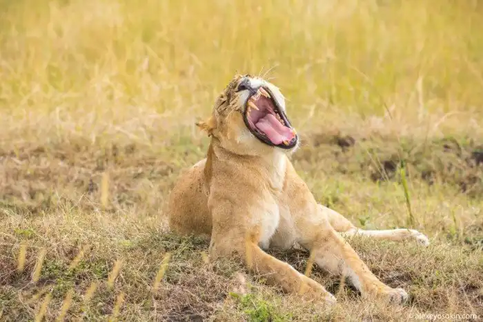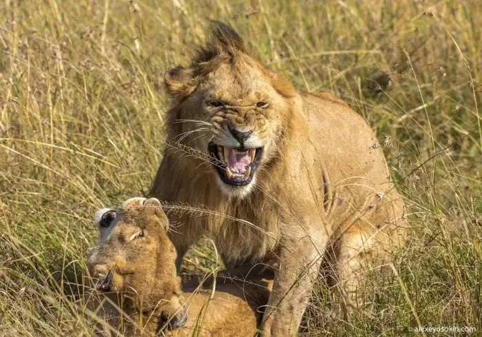 7. Кстати, рык взрослого льва настолько мощный, что рядом с ним буквально содрогается воздух, а слышно его на расстоянии до 10 километров! Я наблюдал картину, как стая шакалов пыталась напасть на небольшой прайд (2 львицы и 3 маленьких львенка). Льва не было рядом, львицы отгоняли шакалов, но мелких шакалов было так много, что силы львиц были на исходе. Вдруг откуда-то из кустов в нескольких сотнях метров от нас, раздался мощнейший львиный рык, от которого шакалы пришли в ужас и бросились врассыпную… Льва мы так и не увидели, но было ясно, что если что, он совсем рядом. А еще при рыке львята прижимают хвосты и на всякий случай боятся.