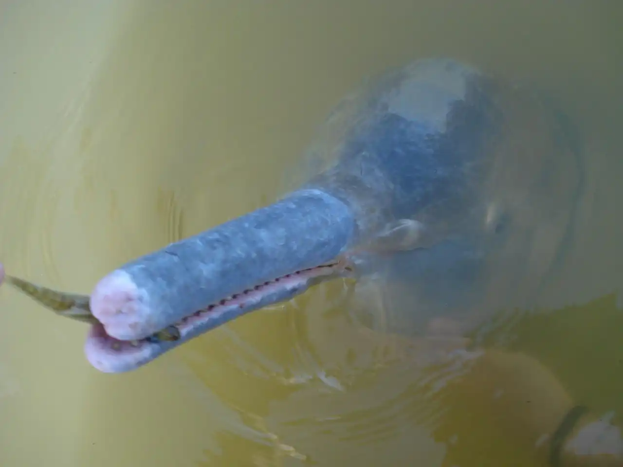 Отличительная особенность речного дельфина от морского - это длинное, кожистое рыло, похожее на клюв или жало. Им очень удобно выкапывать ракообразных из донного ила и вылавливать рыбу. Удивительное строение шейных позвонков которые не срастаются между собой, даёт им возможность поворачивать голову под углом 90 градусов по отношению к туловищу! Подвижная голова облегчает ориентацию, а вытянутым рылом удобно обследовать и обнюхивать завалы из веток на речном дне.