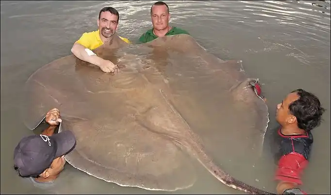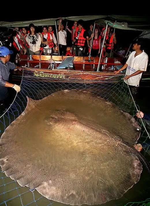 Гигантскиого шипохвостого ската отловили в водах реки Маеклонг. Почти полтора часа рыбаки боролись с ним, поднимая на борт. Когда же монстра все же удалось затащить в лодку, исследователи пришли в восторг: им посчастливилось заполучить самый крупный за всю историю экземпляр. Вес его составил 350 кг, а размеры — два на два метра, не считая трехметрового хвоста.
