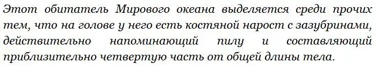 Точное биологическое наименование этой рыбы – пилорыл обыкновенный, и относится он к семейству скатов. На спине у рыбы-пилы (лат. Pristidae) расположены два плавника, а на хвосте – один, причем в отличие от многих других скатов он не имеет шипа.