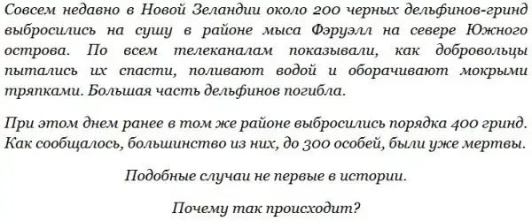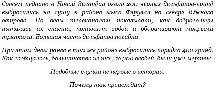 Люди находили морских животных, которые непонятно почему выбрасывались на берег, по крайней мере, с первого века нашей эры – об этом свидетельствуют древнеримские и древнегреческие документы. Сегодня морские биологи берутся назвать причины только половины таких инцидентов, и причины эти самые разные.
