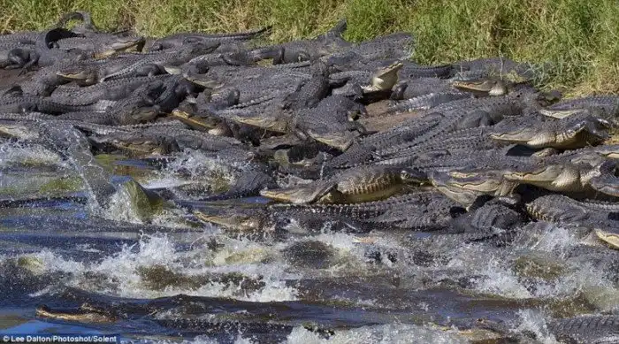 Далтон фотографировал сборище американских аллигаторов с противоположного берега реки - надо сказать, не слишком широкой. "Когда я их увидел, я сначала не поверил своим глазам! - вспоминает Далтон. - Раньше я видел их по одному или маленькими группами, но такое количество сразу даже представить себе не мог!"