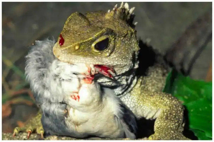 Таутара ночное животное, которое питается насекомыми, червями и иногда птенцами мелких птиц