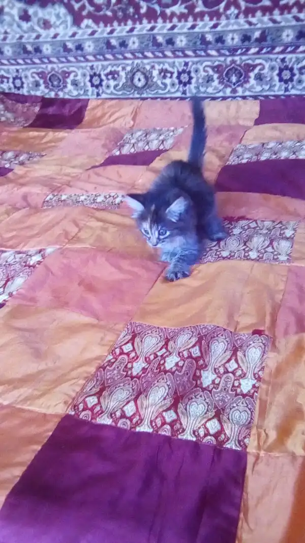Окрас черепаховый, очень пушистая. Спокойная, ласковая, других животных боится.