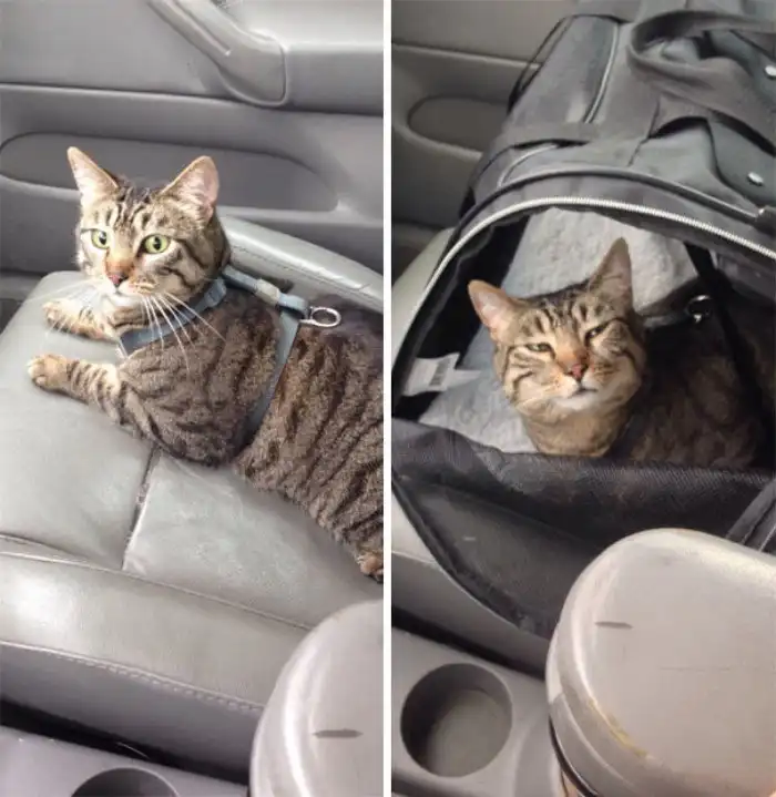 4. До поездки к ветеринару и после. По словам хозяина, кот сохранят второе выражение лица морды всю дорогу