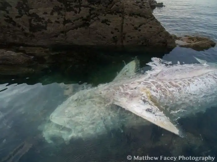 Это был труп Гигантской акулы. Его обнаружил в прошедшее воскресенье фотограф Мэтью Фейси через объектив своего беспилотника, когда он снимал пейзаж береговой линии.