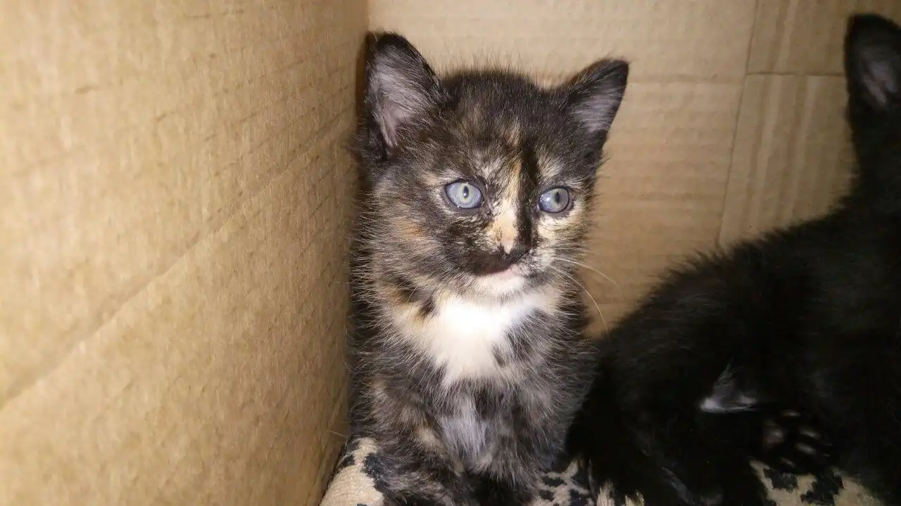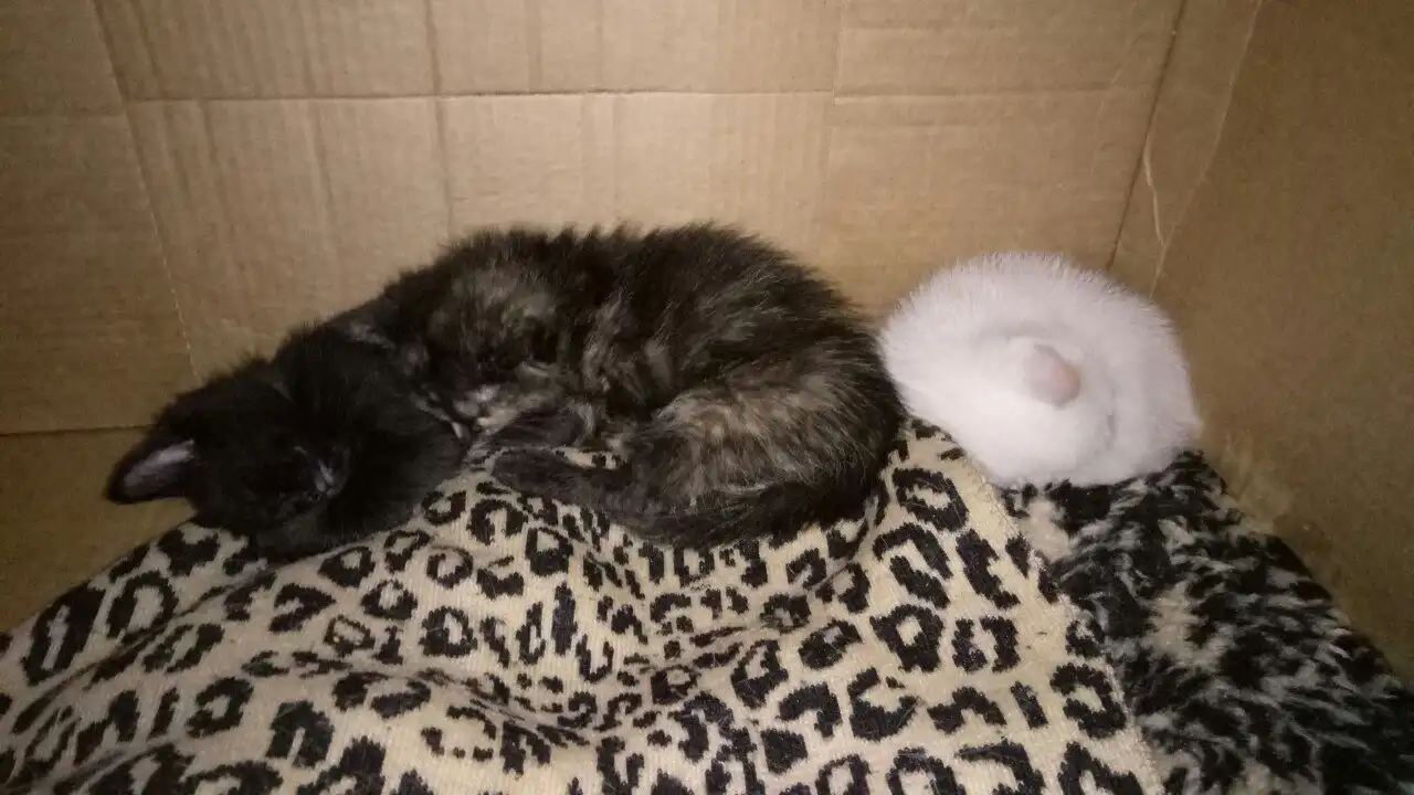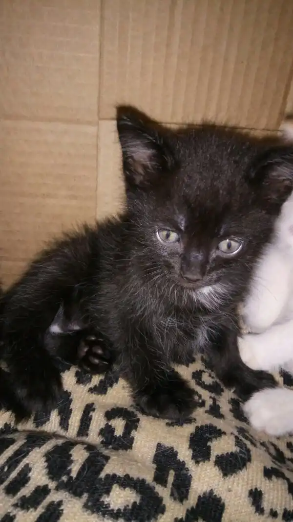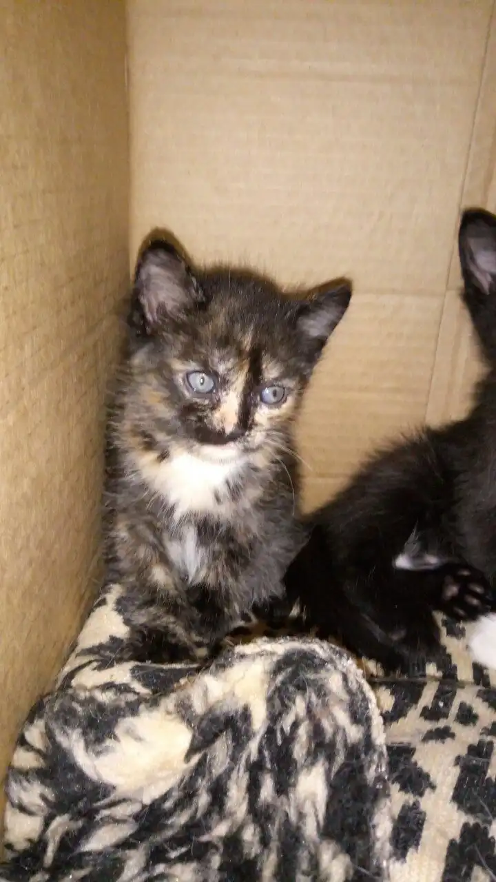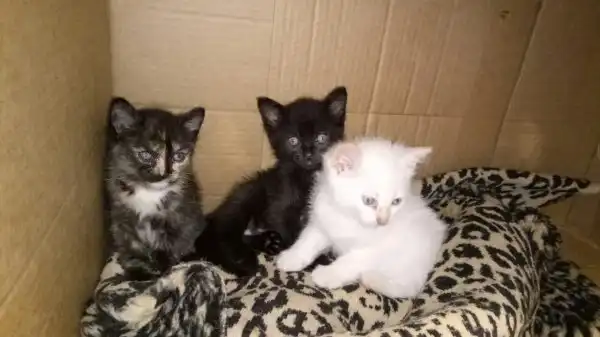 Котята только начали кушать сами, черный мальчик и две девочки.