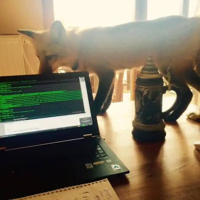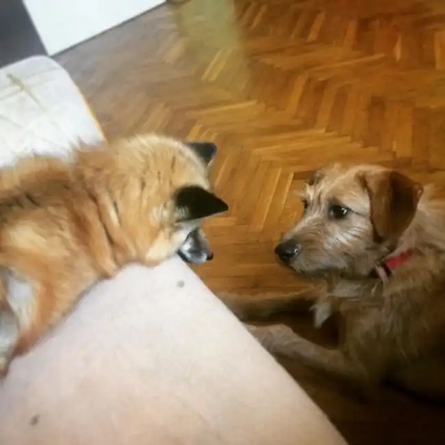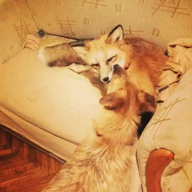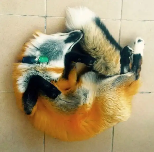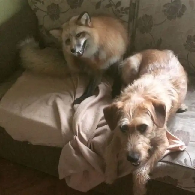 Если бы не добрые люди, спасшие эту очаровательную лису с лисьей фермы, то она, скорее всего, пошла бы кому-то на воротник. Однако ей крупно повезло и сейчас она живет в доме своих спасителей. Здесь у лисы появился верный друг в лице собаки, к тому же в доме проживает кот, который, наверное, не очень хорошо ладит с лисой, а потому старается держаться от нее подальше.