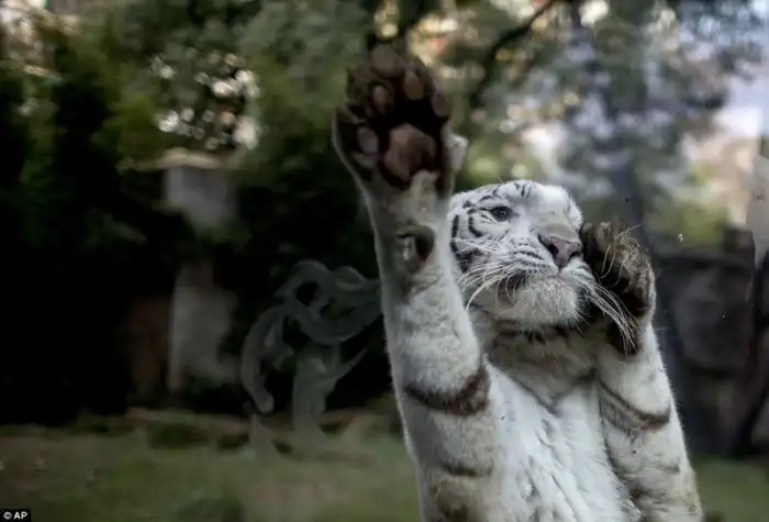 Белая тигрица Клео кидается на стекло, пытаясь атаковать группу художников, рисующих макет будущего парка, который строится на бывшей территории городского зоосада, работавшего с 1875 года.