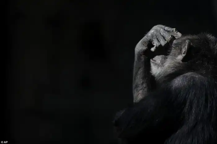 Шимпанзе пытается отвлечься от шума проходящей рядом с вольером улицы.