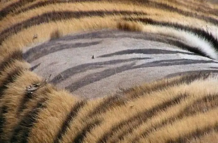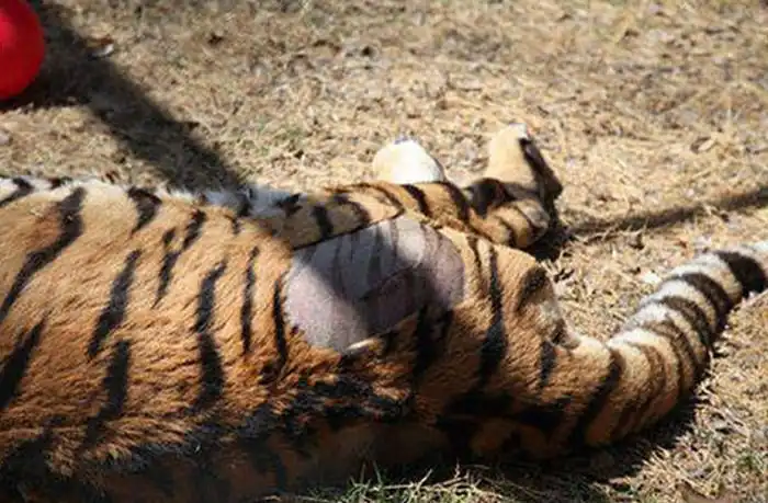 Кожа тигра, как и его шерсть полосатая, что обусловлено волосяными фолликулами. На побритой коже животного отчетливо видны полосы, что можно сравнить с побритой человеческой кожей, где также остаются видны зоны роста волос.