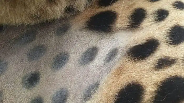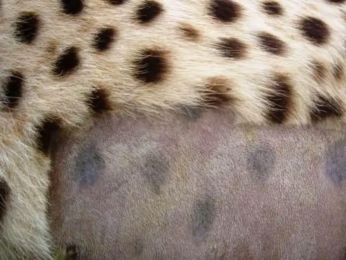 Продолжим издеваться ради науки над его собратом гепардом. Вот его пятнышки на меху и на голой коже, отчетливо виден несмываемый узор.