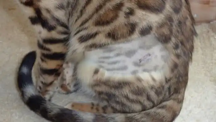Предками современной бенгальской породы кошек были дикие звери из джунглей Юго-Восточной Азии, а так как селекция ведется по историческим меркам недолго, около полувека, то пятен на коже они еще не утратили.