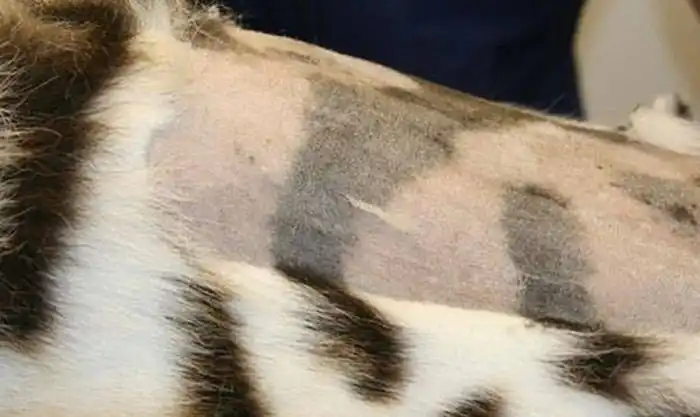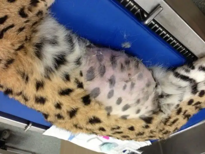 Еще пример — большой котик сервал во время подготовки к операции был тщательно побрит, что позволяет сравнивать состояние меха и шкурки
