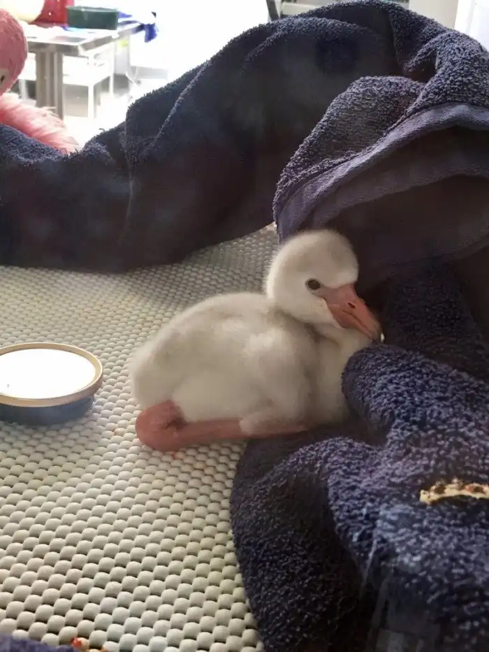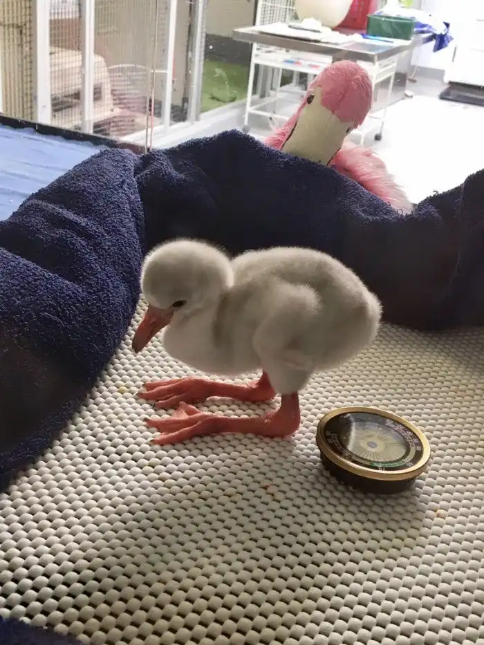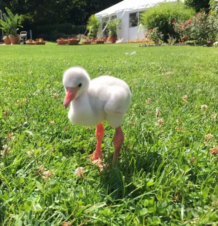 Розовый окрас у взрослых особей объясняется пищей, которую они едят. Она богата веществом каротиноидом, которое придаёт оперению розово-оранжевый и даже красноватый цвет. Малыш фламинго пока явно не объелся каротиноидом, но в том, что он правда фламинго, нет сомнений.