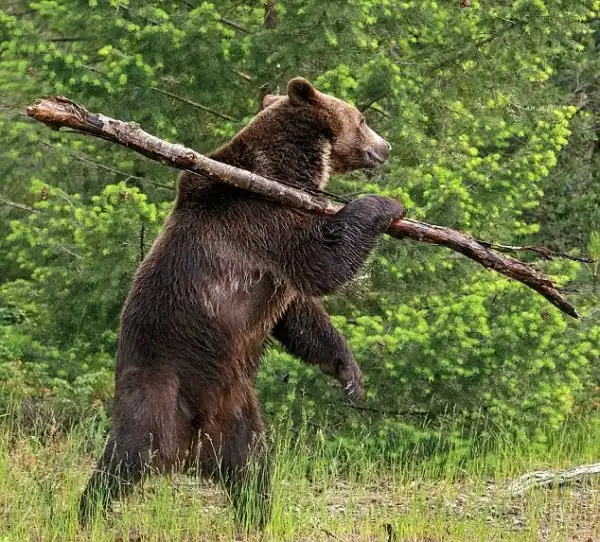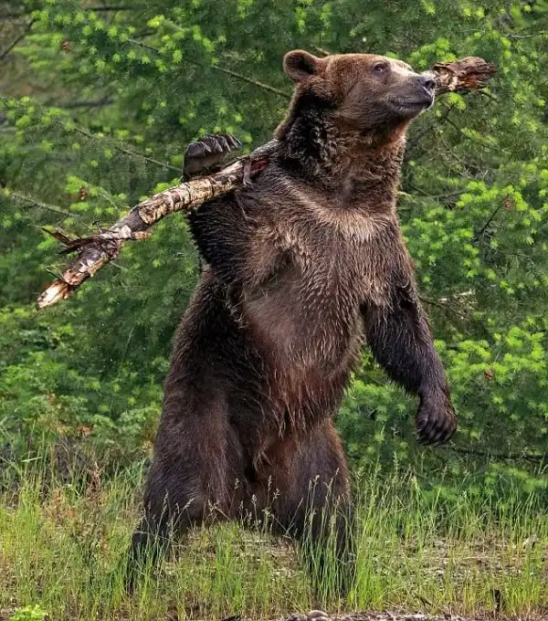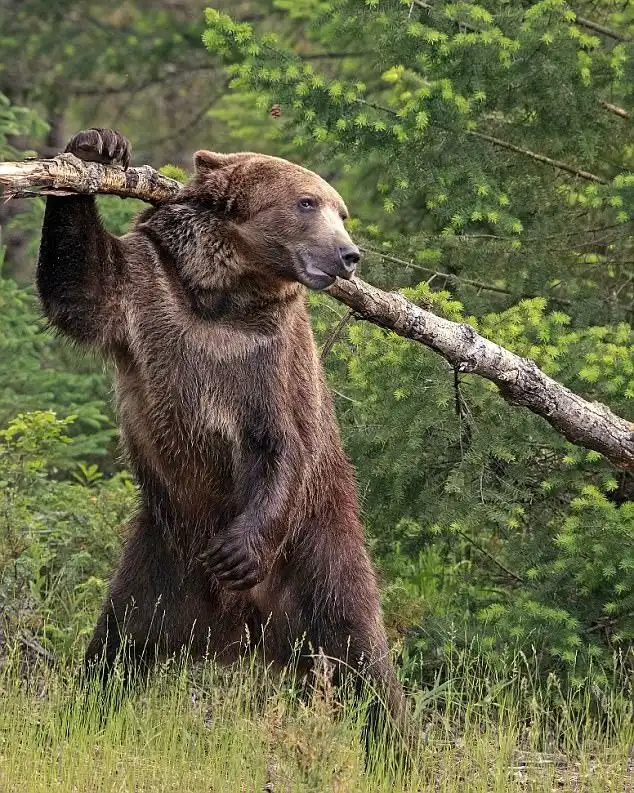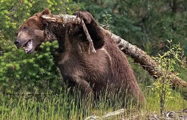 Забавные кадры снял фотограф Shayne McGuire на ферме в штате Монтана в США. Пятилетний гризли Бруно, словно подражая своему собрату Балу из мультфильма «Книга джунглей», взял ствол старого дерева и усердно чесал им спину.