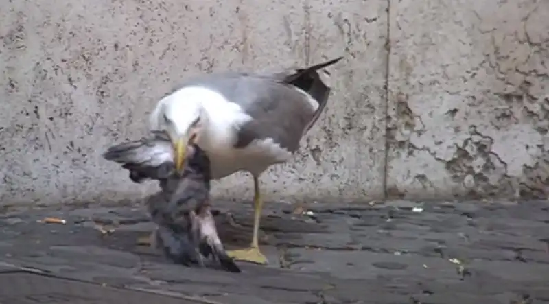 Героиня нашего сегодняшнего поста была запечатлена в столице Италии Риме, где ей удалось заклевать до самой смерти беззащитного голубя. И если вы думаете, что на этом все закончилось, то хотим вас заверить, что это не совсем так, ведь жестокая птица сделала это для того, чтобы в дальнейшем полакомиться птицей мира.