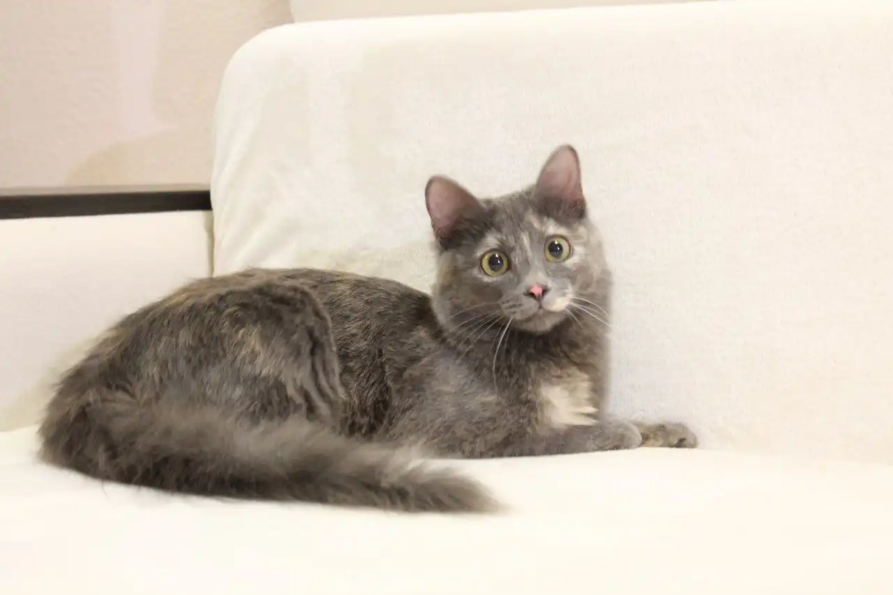 Меня нашли в конце апреля возле стройки. Меня помыли, обработали от паразитов и поставили прививки. Я очень хорошая, добрая, ласковая кошка, игривая, хорошо ладит с другими животными (у меня тут двое соседей).