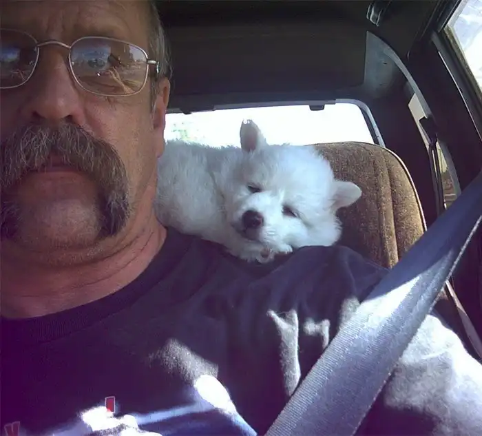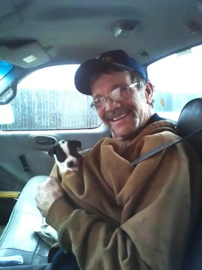 "После того, как старый пес дяди умер в 14 лет, тетя привезла ему щенка. Это был сюрприз - дядя думал, что они просто едут за покупками. Вот их первая встреча"