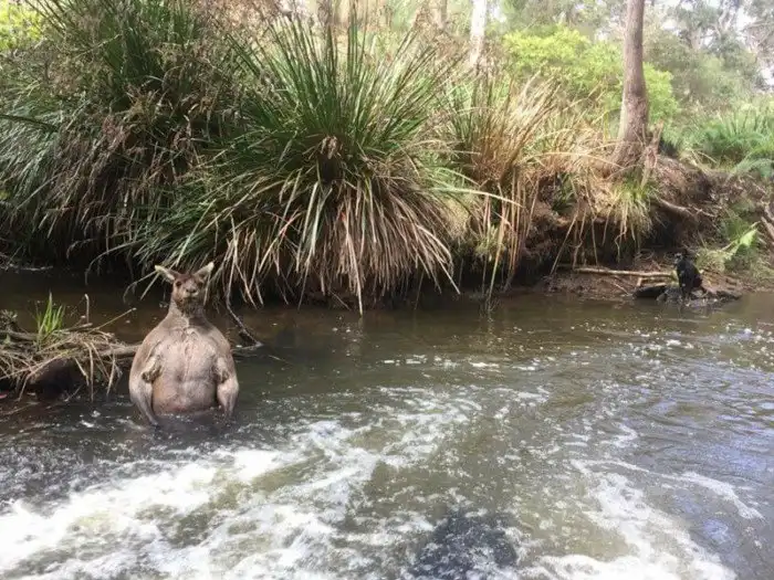 Хотя, к чести фотографа, он не испугался здоровяка и сделал снимки с нескольких ракурсов. Судя по выражению кенгуриной морды, накачанная зверюга была не очень довольна, что её банные процедуры прерывают таким бесцеремонным образом.
