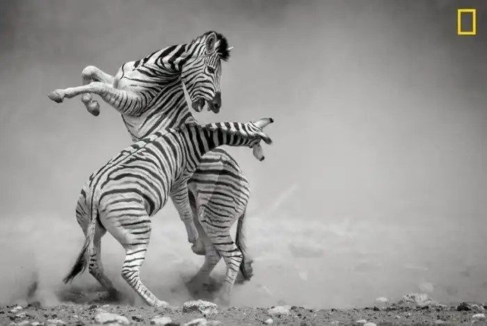 Дуэль: два самца зебры дерутся в национальном парке Этоша в Намибии. "Я снимал зебр у водопоя, - рассказывает фотограф Соналини Кетрапал. - Вдруг вокруг животных поднялась туча пыли. Вскоре из нее появились два самца, изо всех сил молотящих друг друга копытами. Дуэль продолжалась лишь несколько минут, однако я успел запечатлеть это впечатляющее зрелище".