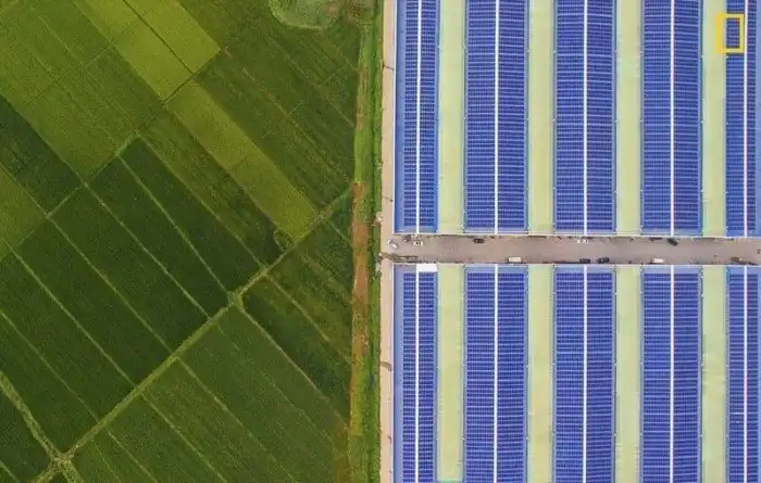 Когда природа встречается с творением рук человеческих. Слева - крестьянские поля, справа - торговый центр. Фотограф - Гуануй Гу.