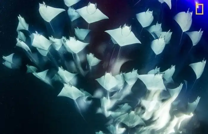 Стая морских скатов в глубине океана. Фотограф - Франко Банфи.