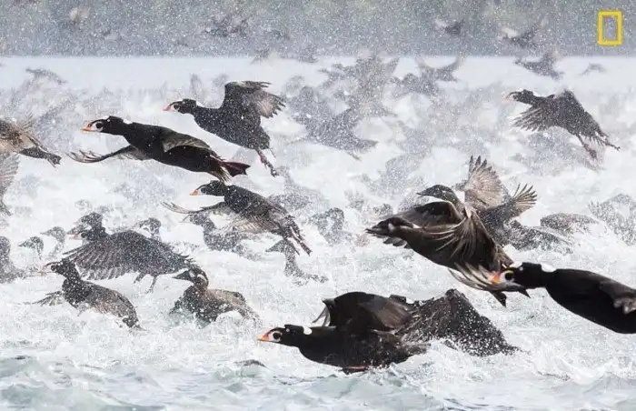 Стая пестроносых турпанов на Большом Медвежьем озере, Британская Колумбия, Канада. Фотограф - Сэм Эдмондс.