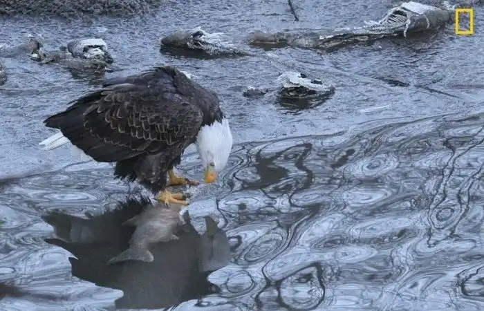Белоголовый орлан расклевывает скелет кеты на реке Нуксак в штате Вашингтон. Фотограф - Кэролайн Уотсон.