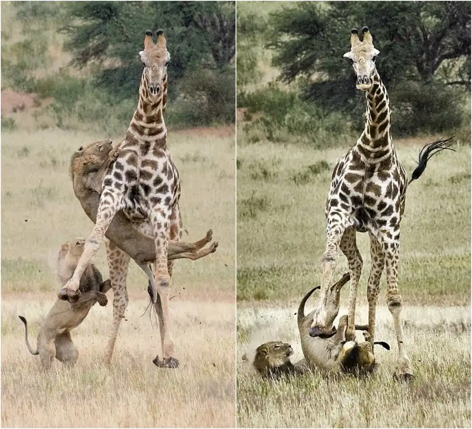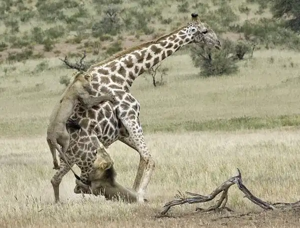 Два молодых льва напали и убили жирафа в парке Кгалагади (Ботсвана). Львы обычно редко нападают на жирафов, можно получить такой удар, что мало не покажется. Но у этого жирафа были деформированы копыта и львы, чувствуя легкую добычу, атаковали его. Эти драматические кадры снял фотограф Майкл Коэн (Michael Cohen).