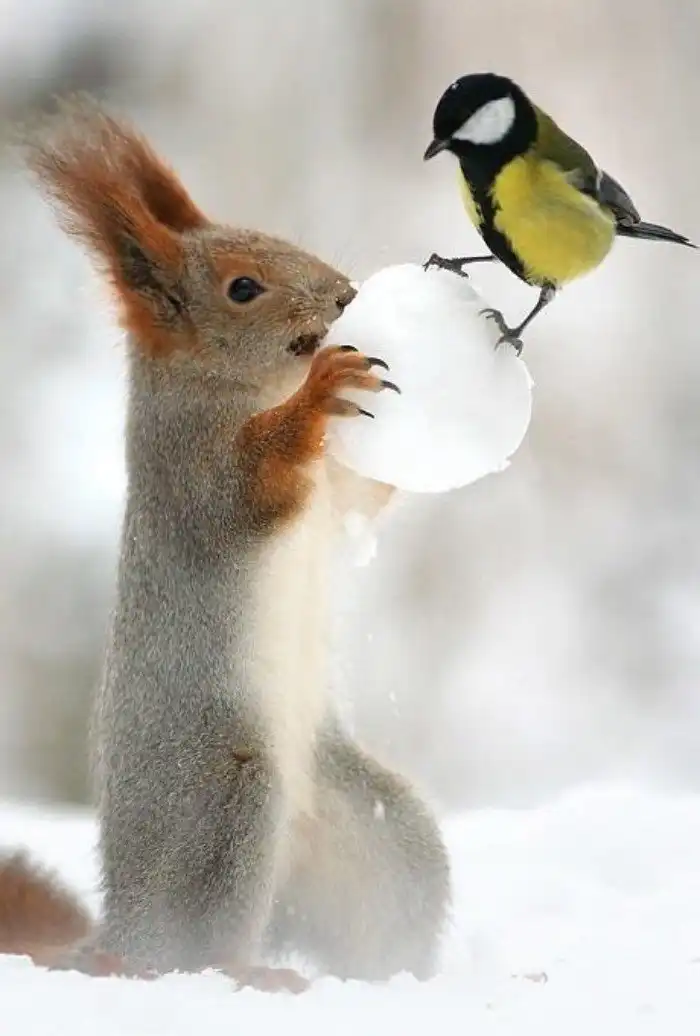 33-летний фотограф Вадим Трунов стал свидетелем интересной сцены в одном из лесов Ростова. Мужчина нередко приносит лакомства белкам, но тут решил поиграть с ними и спрятал орешек в снежок. Белка только хотела вытащить угощение, как подлетела синица и украла орешек.