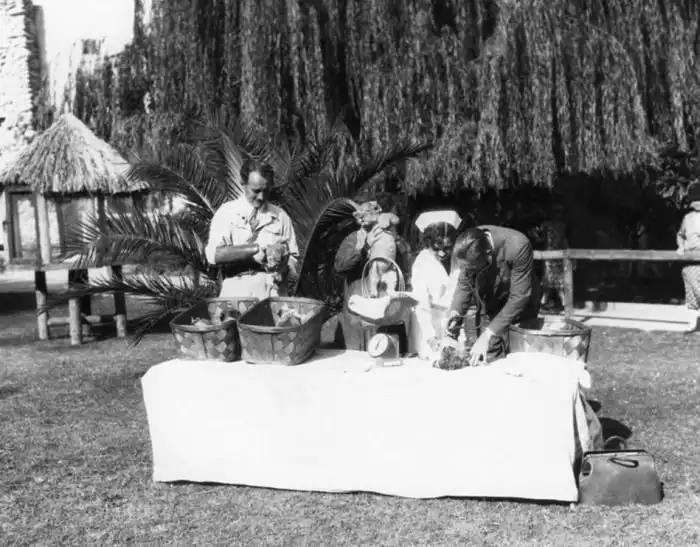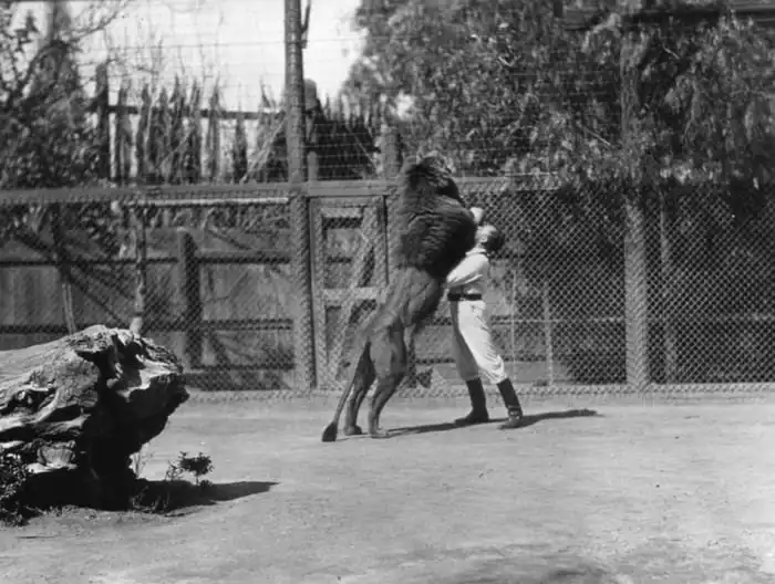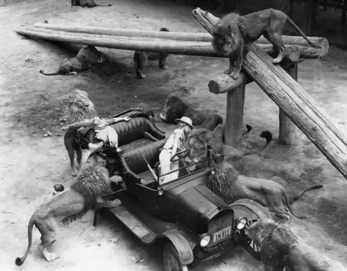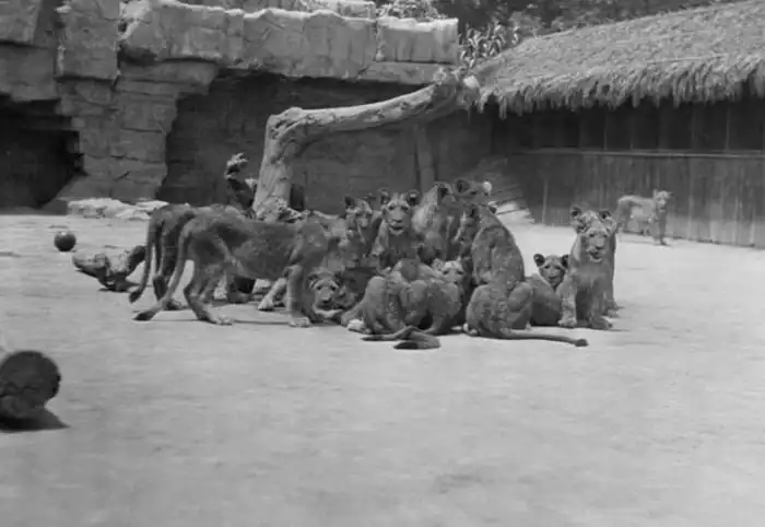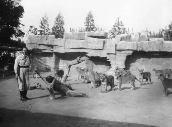 Перед вами винтажные снимки львиной фермы, которая в 1925 году была открыта в городе Эль-Монте, штат Калифорния, США. Ферму основали цирковые артисты Черльз и Мюриэль Гей. Около 200 хищников жили в большом парке, где их учили и тренировали для съемок в кино и выступлений на цирковых аренах. Ферма пользовалась популярностью среди посетителей и проработала до 1942 года, после чего была закрыта в связи с нелегким положением, вызванным Второй мировой войной.