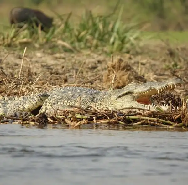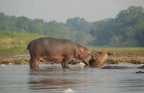 Бегемот спас водяного козла от крокодила
