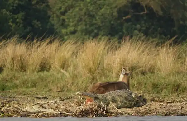 Свидетелем удивительных событий стал 25-летний гид Бренден Симонсон (Brenden Simonson) в национальном парке Мерчисон-Фолс, Уганда. В реке Белый Нил крокодил схватил водяного козла (waterbok) и удерживал уже в течении часа, оба животных выбились из сил. Неожиданно на помощь антилопе пришел бегемот, он отогнал крокодила и вытолкал обессиленного водяного козла на берег реки, где тот остался набираться сил.