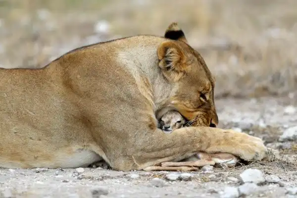 Глядя на эти кадры, можно подумать, что львица играет с едой, но это не так. Большая хищная кошка заботиться о маленькой антилопе спрингбок, как о собственном потомстве. Хоть антилопа и является естественной добычей, эта скорбящая львица приняла теленка после того, как ее собственных детенышей убил лев из конкурирующего прайда. Львица нежно ухаживает за антилопой и оберегает ее от опасностей. Она даже защитила теленка от пары беременных львиц, которые бродили в поисках пищи. Эти умилительные кадры сделал фотограф из Нью-Йорка Гордон Донован (Gordon Donovan) в Национальном парке Этоша в Намибии.