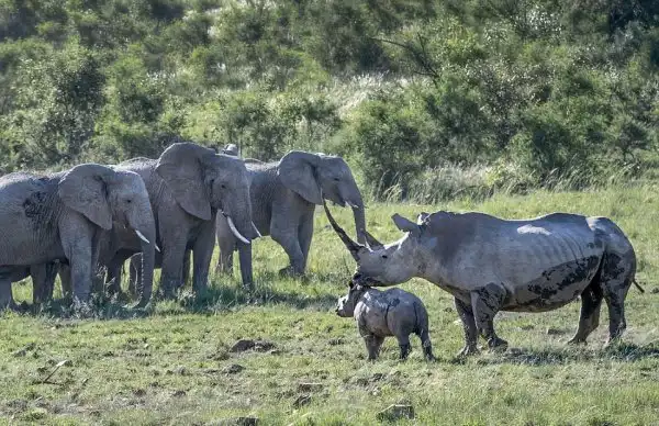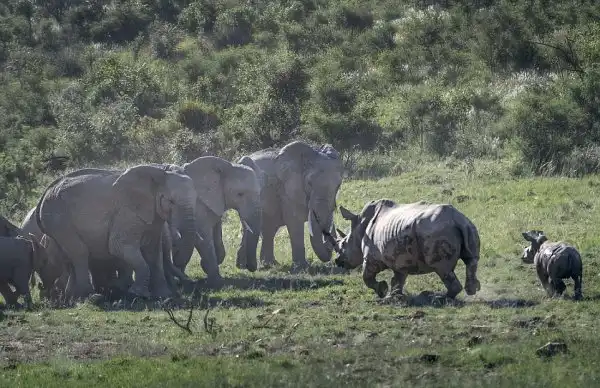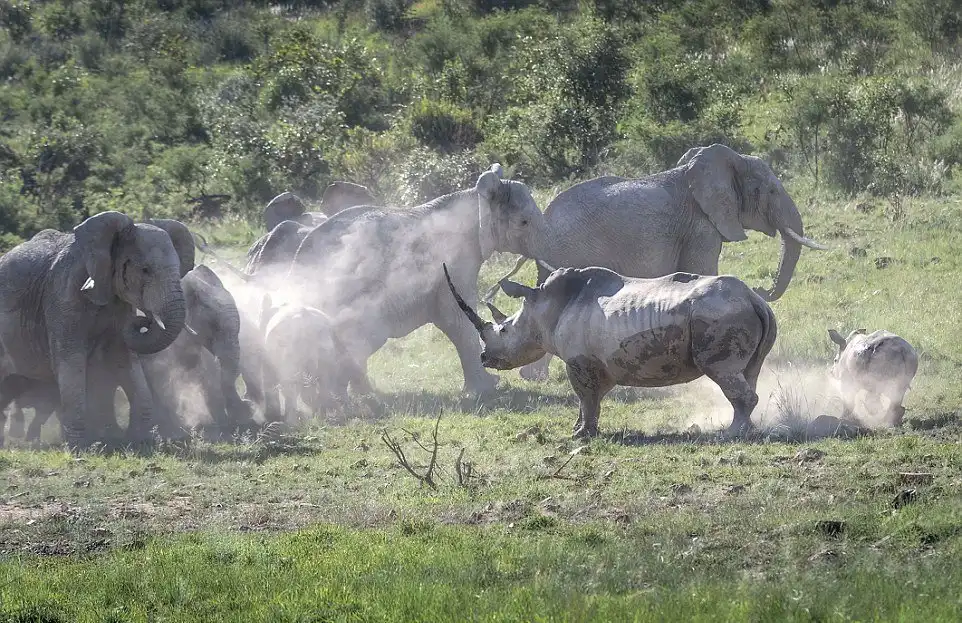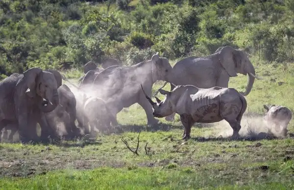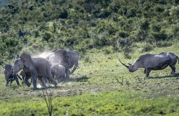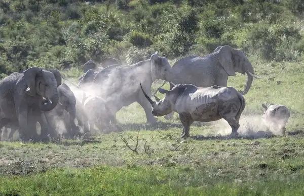 Свидетелем интересных событий стал Мартин Мейер (Martin Meyer) во время посещения национального парка в Южной Африке в середине января. Стадо из 15 слонов встретило на своем пути самку носорога с детенышем. Когда слоны приблизились примерно на 20 метров к носорогам, самка резко бросилась в сторону стада, почувствовав опасность для ее малыша. Несмотря на то, что самка носорога весит до двух тон, а взрослая самка африканского слона может весить почти три, слоны решили не связываться с сумасшедшей мамашей с полутораметровым рогом и отступили. Они еще постаяли несколько минут, глядя друг на друга, затем носороги ушли, освободив дорогу слонам.