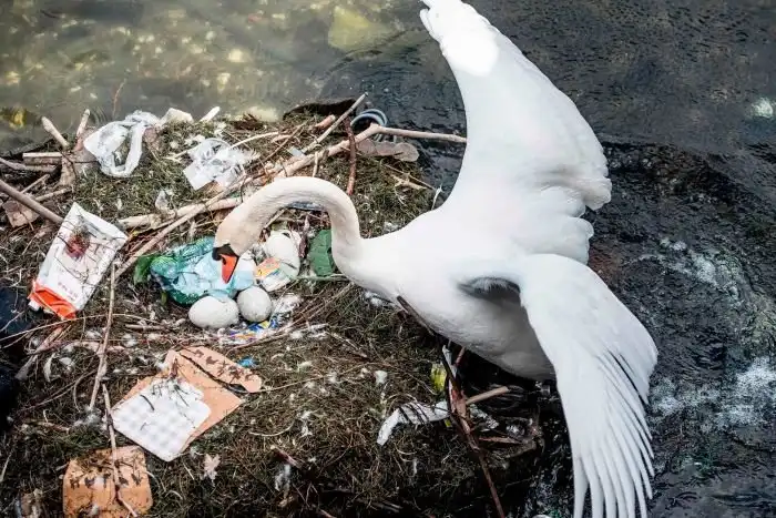 Даже животные уже смирились с тем, что наша планета сильно загрязнена мусором и стали использовать его в своих целях. Так в центре Копенгагена, Дания, на озере заметили гнездо лебедя, свитое из всякого хлама. Самое примечательное, что самка даже отложила сюда яйца.