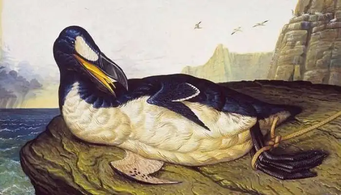 Крупная нелетающая птица бескрылая гагарка, обитавшая в холодных прибрежных водах Северной Атлантики, достигала 85 сантиметров в длину и веса около 5 килограмм. Из-за охоты людей на птицу ради её мяса, пуха и использования в качестве наживки её численность сильно сократилась уже к 16 веку. Последний раз бескрылую гагарку видели в середине 1800-х годов. Она стала первой из европейских и американских птиц, полностью уничтоженных человеком.