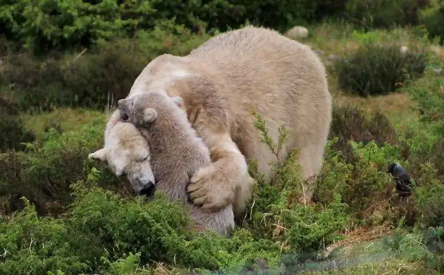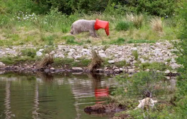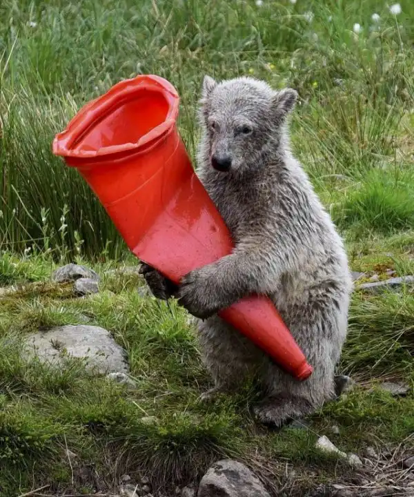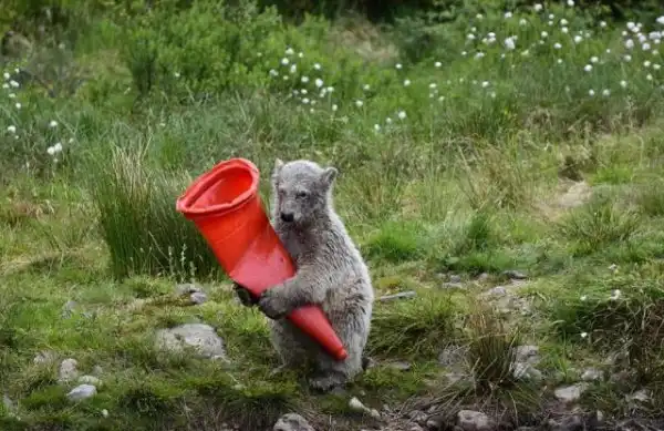 Белый медвежонок по кличке Hamish — первый полярный медведь, рожденный в Великобритании за 25 лет. Он живет в Highland Wildlife Park недалеко от Кингусси в Баденох. Медвежонок родился в декабре прошлого года, а имя ему выбирали 21 000 поклонников парка через онлайн-опрос. Недавно мишка попал в курьезную ситуацию: он играл с дорожным конусом и нечаянно надел его на голову. Конус застрял и медвежонок около часа бегал, пытаясь снять пластмассовую "шляпу". Когда ему это удалось, медвежонок со злобой швырнул конус в води и бросился в объятия мамы.