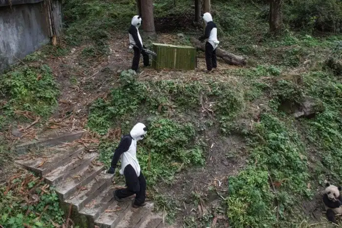 Все работники заповедника, взаимодействующие с пандами, которых готовят к жизни в дикой природе, должны носить костюмы панд.