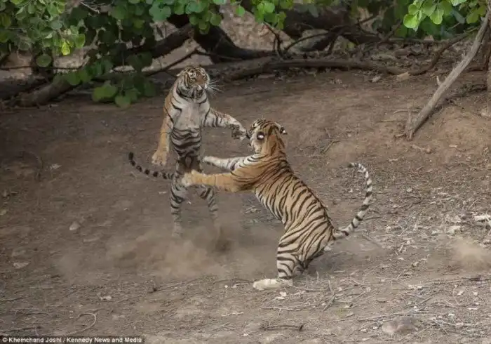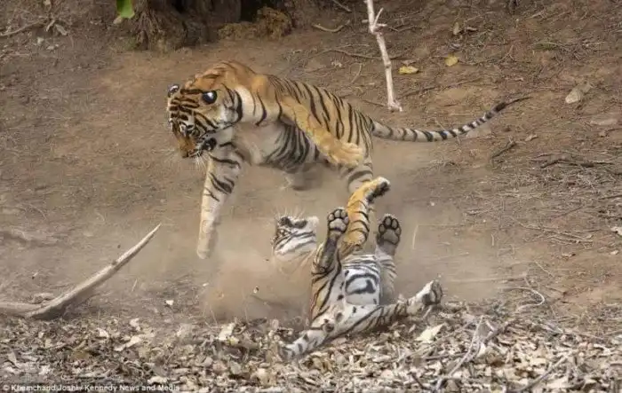 Фотографу удалось снять жесткую схватку тигрицы и взрослым самцом, который вторгся на её территорию.