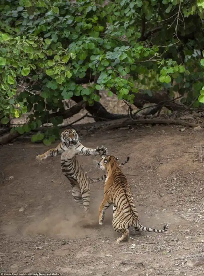 Слева — разъярённая тигрица. Справа — наглец, которые пришел на её территорию.