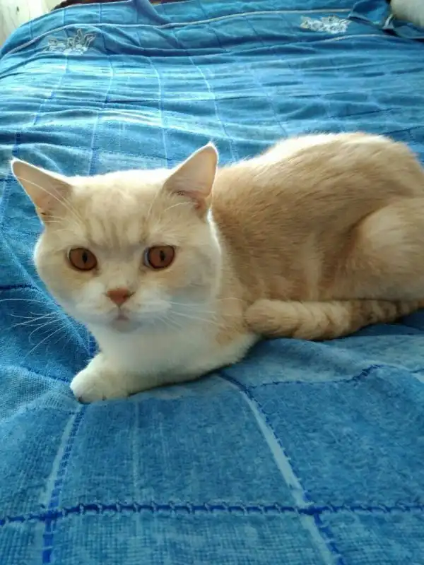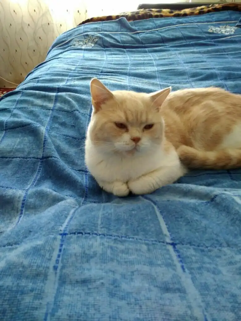 Окрас бежево-рыжий с белыми разводами, на лапках - белые сапожки.