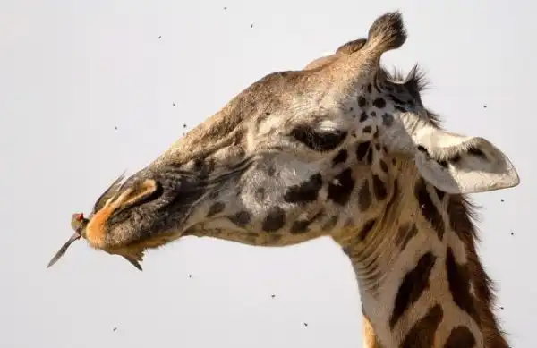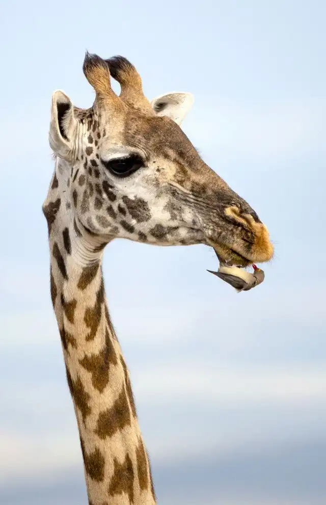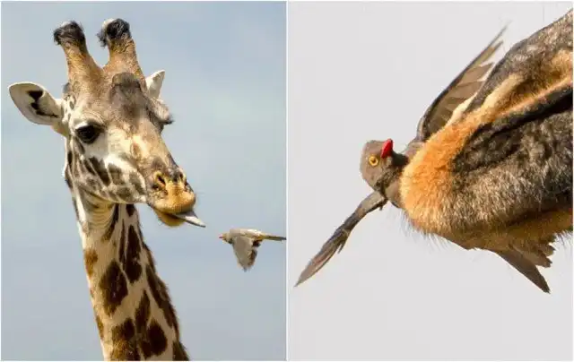 Эти занятные фотографии демонстрируют странные отношения между самым высоким млекопитающим животного мира жирафом и крошечными рыжими скворцами в Восточной Африке. То, что изначально может выглядеть как жираф, охотящийся на маленьких птиц, на самом деле является гигиенической процедурой. Жирафам чистят зубы буйволовые скворцы. Птички питаются кусочками пищи, застрявшими между зубами жирафа. Они также поедают насекомых и паразитов с шерсти крупных копытных животных.