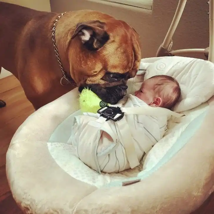 Пес по кличке Брут делится своей любомой игрушкой с плачущим младенцем