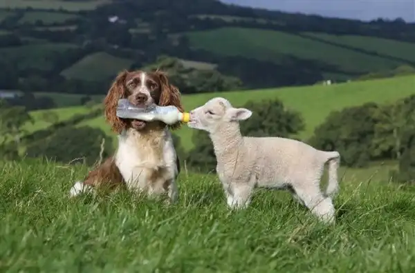 Ничего необычного, просто заботливый пес кормит из бутылочки ягненка