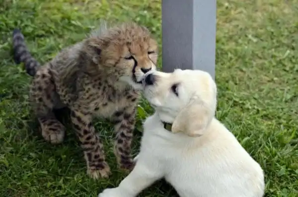 Этот милый щенок в зоопарке помогает гепарду успокоиться. Гепарды — очень нервные животные и часто нуждаются в поддержке
